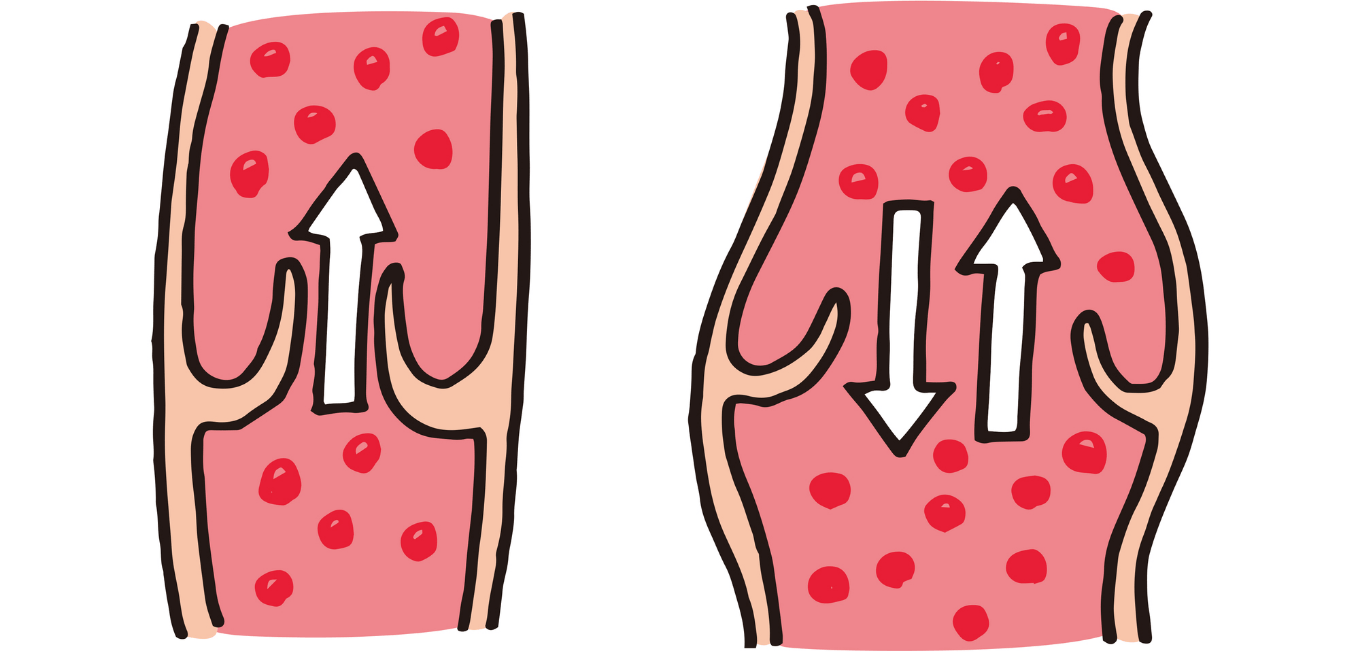心臓から送り出された血液は動脈を通って全身に送られ、その後、静脈を通って心臓に戻ります。足の静脈では、重力に逆らって血液を上へ戻す必要があるため、血液が逆流しないように「弁(べん)」がついています。